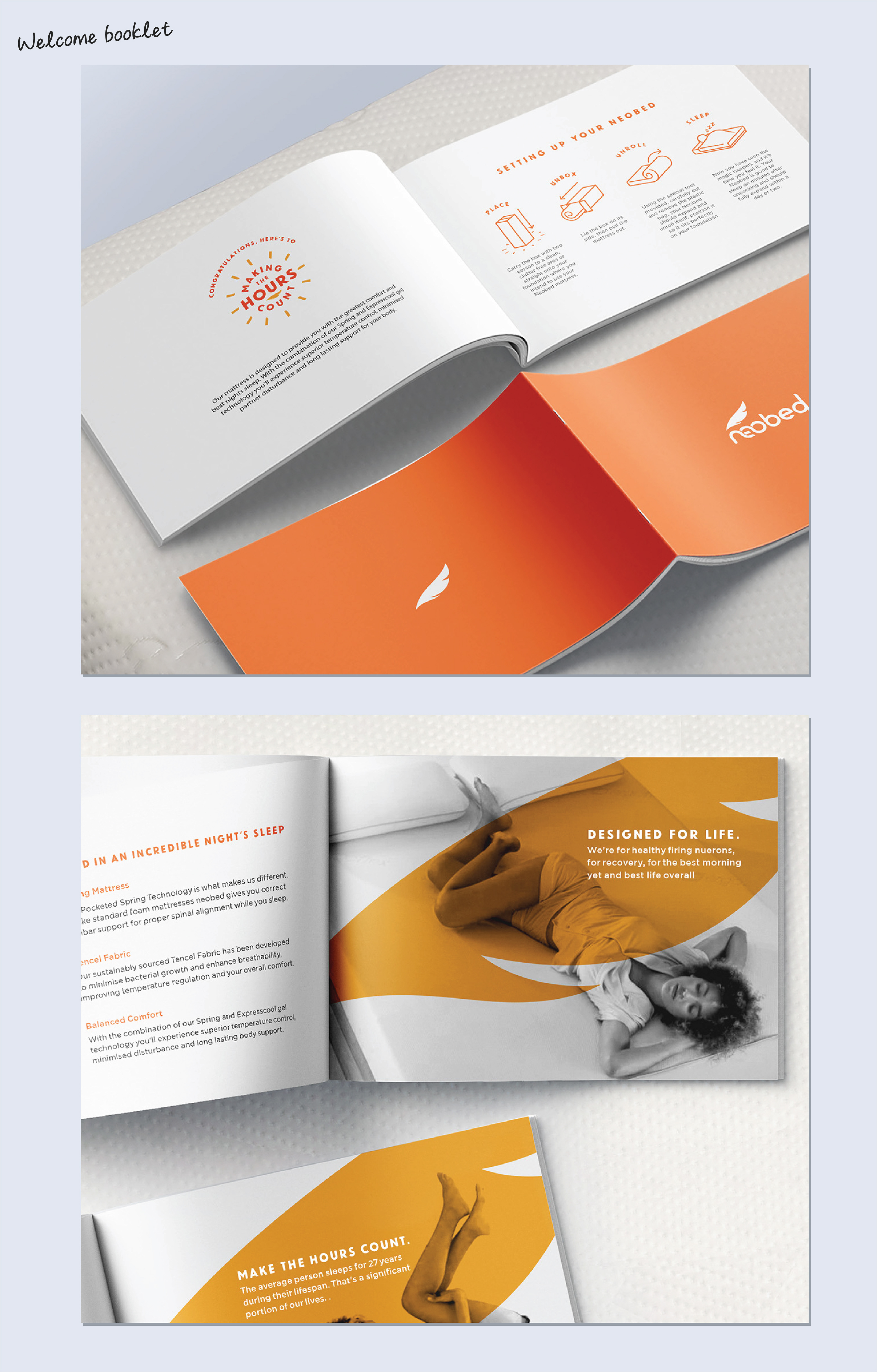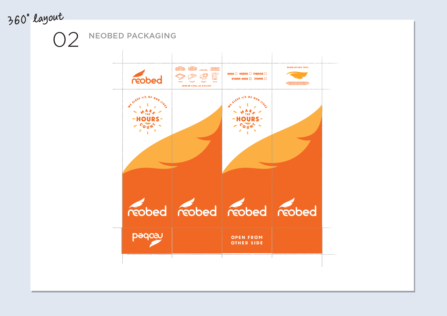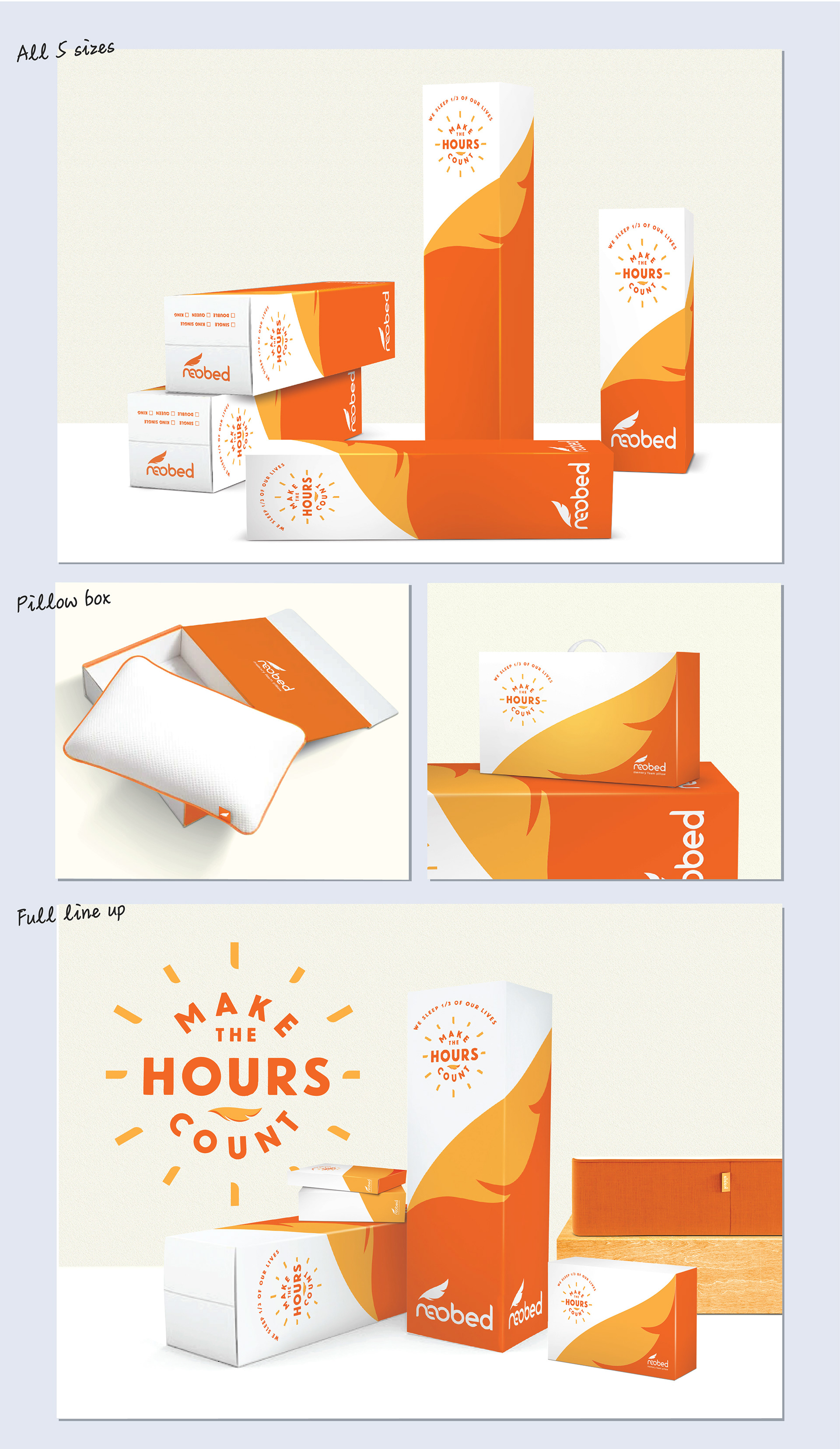 Neobed were entering the highly competitive 'bed in a box' market. As a point of difference, rather than focusing on the comfort of the mattress we took the perspective of how great you feel after a great night's sleep - Vitality over Sleepiness. It became much more than a straight forward packaging brief, we needed to go back and build meaning into the brand, give it a purpose and point of being. The slogan we created "Make the hours count" became the strength of the brand that everything else revolved around.