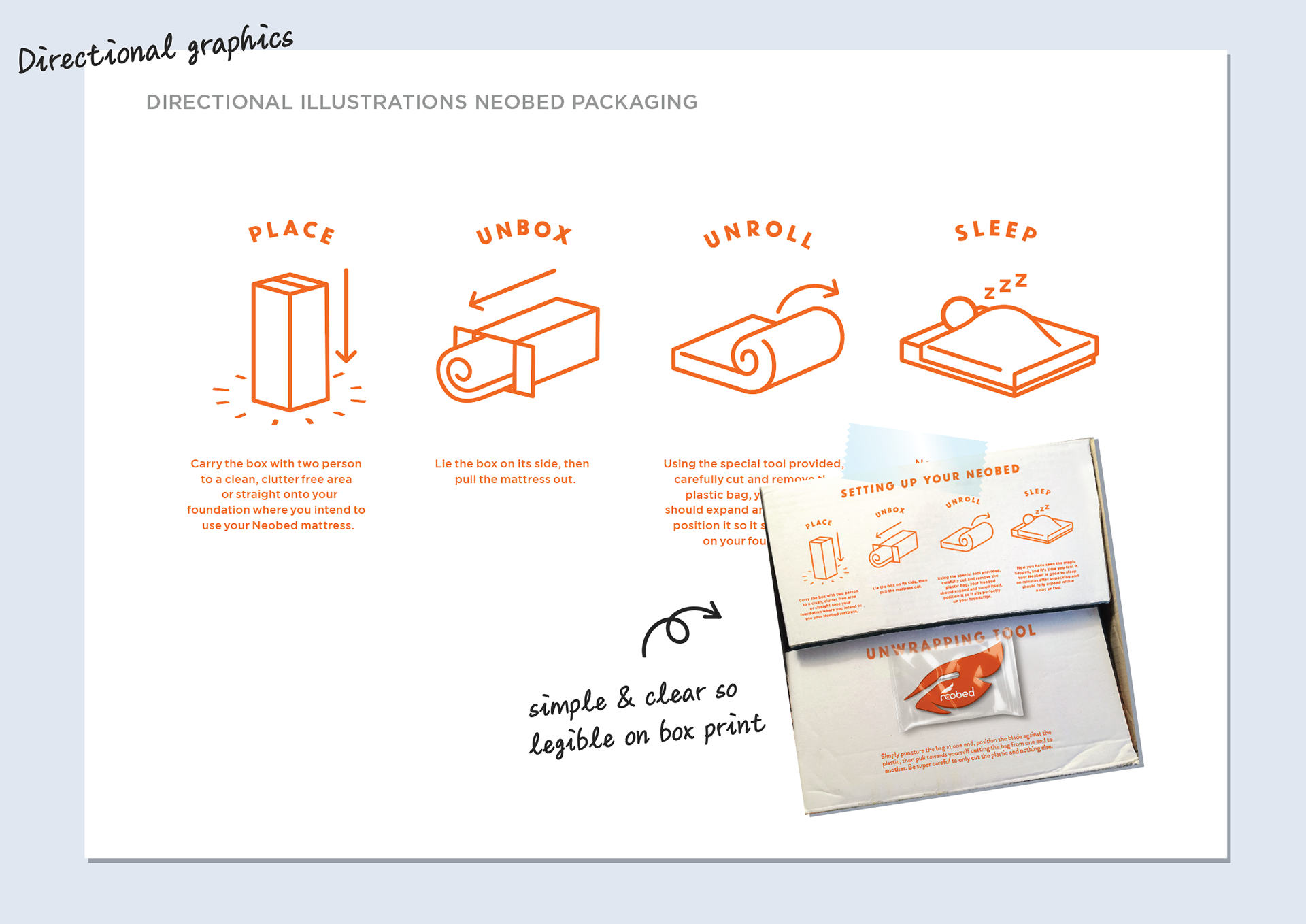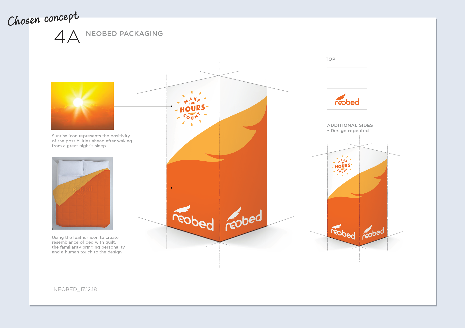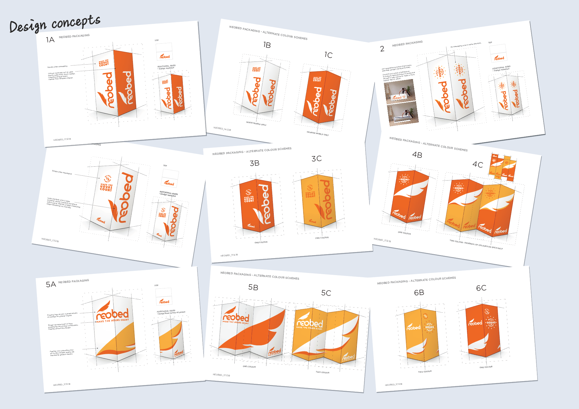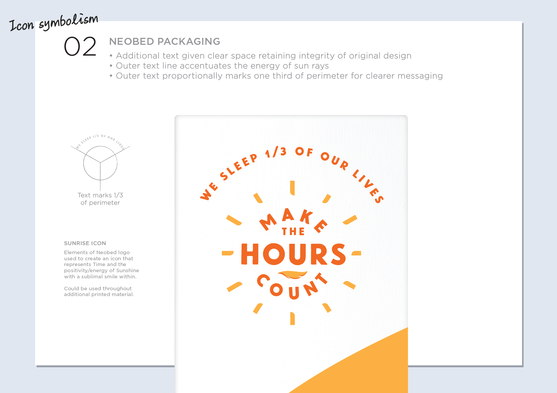 Neobed were entering the highly competitive 'bed in a box' market. As a point of difference, rather than focusing on the comfort of the mattress we took the perspective of how great you feel after a great night's sleep - Vitality over Sleepiness. It became much more than a straight forward packaging brief, we needed to go back and build meaning into the brand, give it a purpose and point of being. The slogan we created "Make the hours count" became the strength of the brand that everything else revolved around.